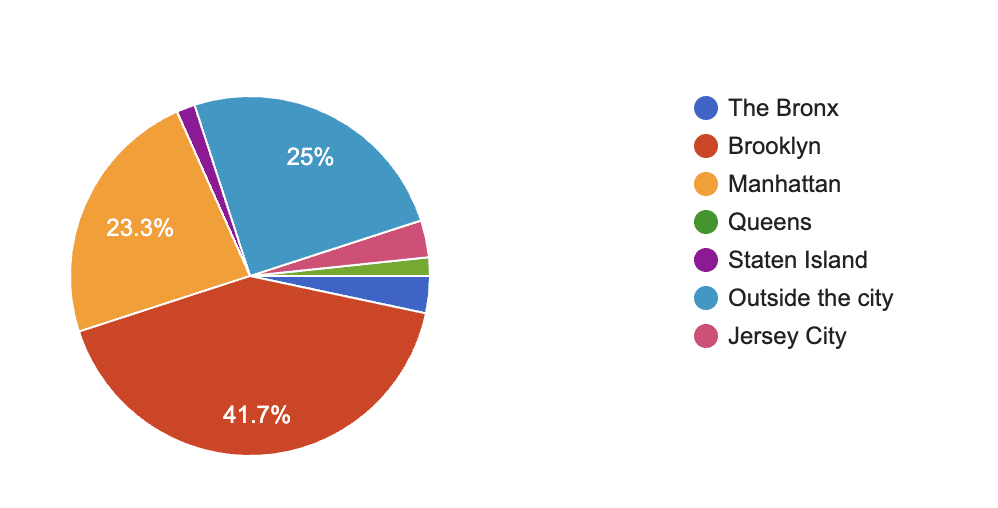 Perhaps unsurprisingly for anyone familiar with jazz in NYC, Brooklyn was the most representative borough (42%) followed by Manhattan (22%).