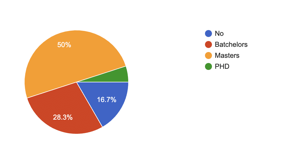 A straight 50% of respondents reported having a masters degree in music, with just 17% noting no formal music college education.